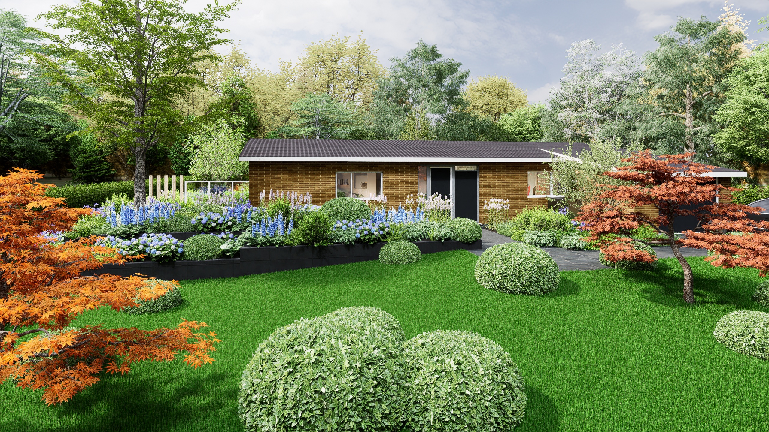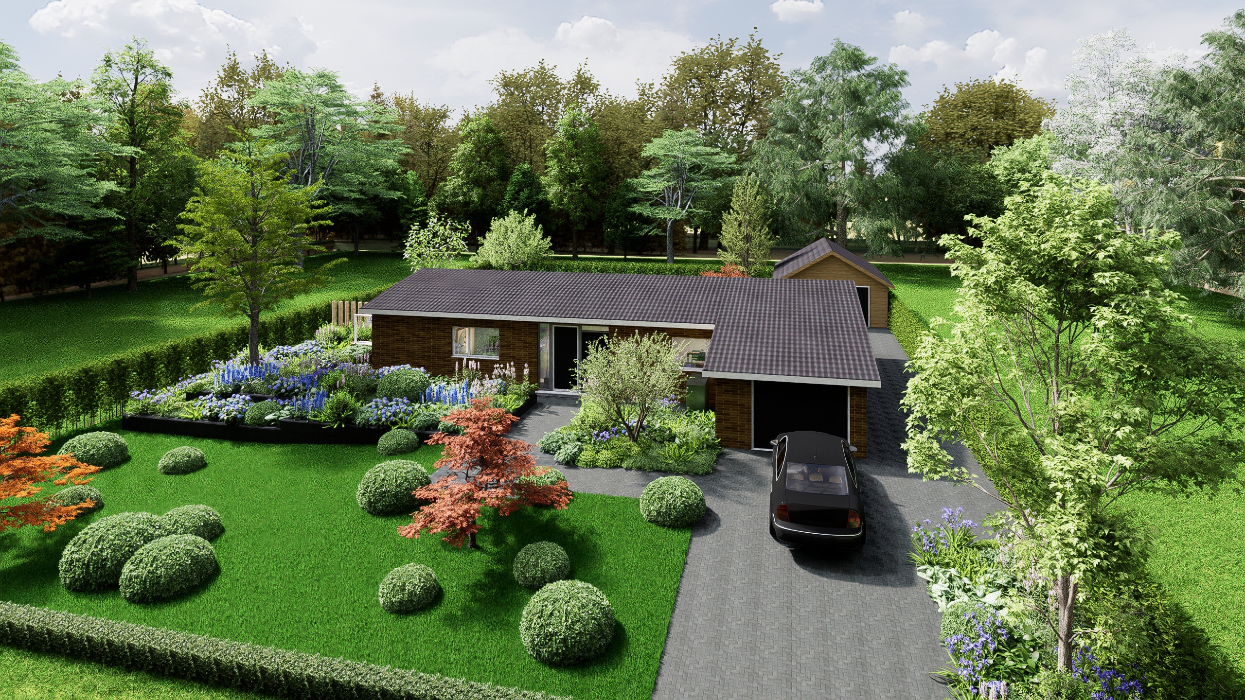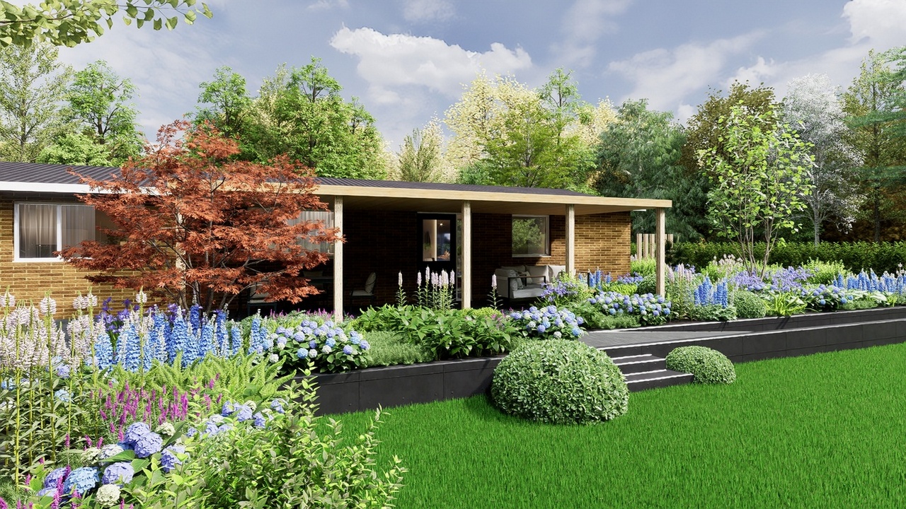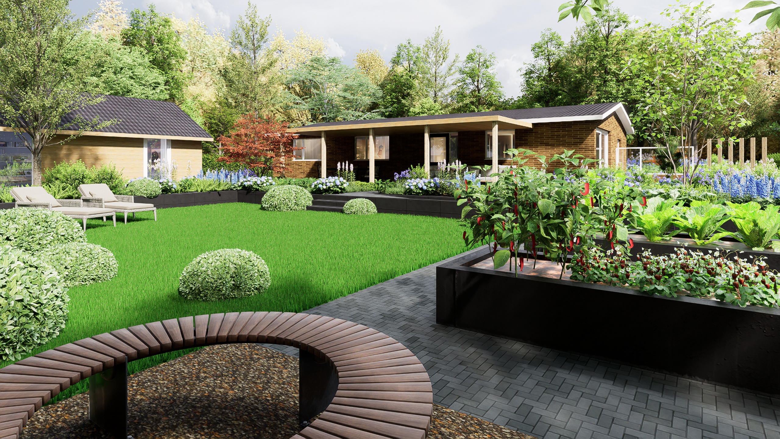 In deze tuin hebben we gewerkt met verhoogde plantenbakken en duidelijke hoogteverschillen voor extra diepte en structuur.